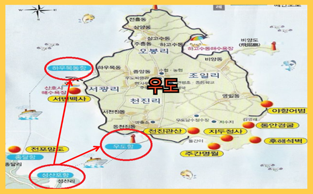 - 우도행 배는 우도의 두 항구(하우목동항, 천진항)에 도착합니다.